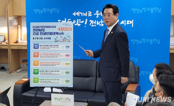 김영록 전남도지사는 15일 도청 지방기자실에서 기자간담회를 열고, 지난해 3월 러-우크라이나 사태에 따른 종합지원대책과 7월 물가 민생안정 긴급대책, 12월 경제위기‧가뭄 긴급대책에 이은 네 번째 긴급대책을 발표했다.