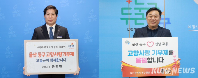 전남 고흥군은 공영민 군수가 21일 자매결연도시인 울산 동구 김종훈 구청장과 고향사랑기부금을 교차 기부했다고 밝혔다.