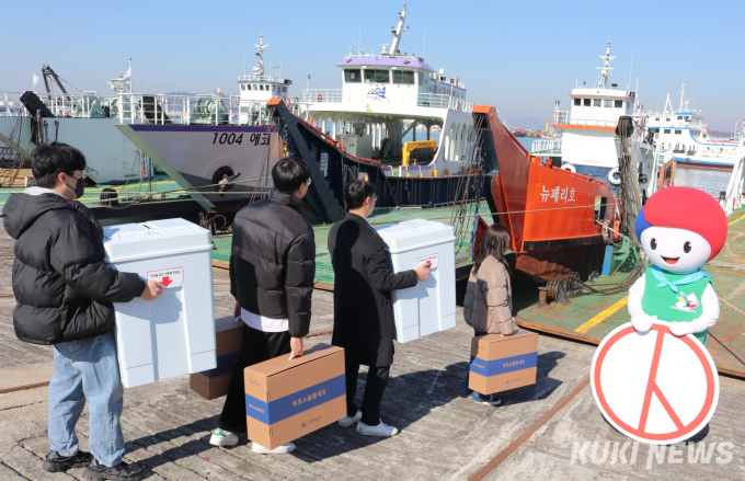 전남선거관리위원회 직원들이 제3회 전국동시조합장선거와 관련, 목포시 북항 선착장에서 섬 지역 순회투표를 위해 투표함을 여객선에 싣고 있다. 사진=전남선관위