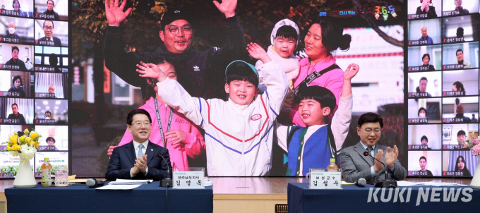 김영록 전남도지사가 14일 오전 ‘도민과 더 가까이, 행복한 만남’을 위해 보성군청에서 보성군민과 함께하는 2023 도민과의 대화에서 김상일 다자녀가정이 영상으로 깜짝 출연해 전남도를 응원했다. 사진=전남도