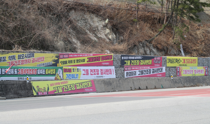 이들 주민들은 7번국도 주변과 마을 곳곳에 현수막 수십장을 걸고 그물건조장 조성사업 철회를 주장하고 있다.