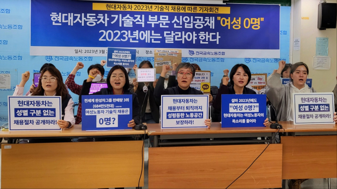 실제로 현대자동차는 창사 이래 생산직 신입 공채에서 여성 직원을 한 명도 채용한 이력이 없는 것으로 나타났다. 권수정 금속노조 부위원장은 “똑같이 현대자동차를 만드는 미국 엘리바마 공장은 여성 노동자의 비율이 36%”라며 "우리나라가 27년째 OECD 국가 중 성별 임금 격차가 최하위를 기록하고 있다"고 설명했다.