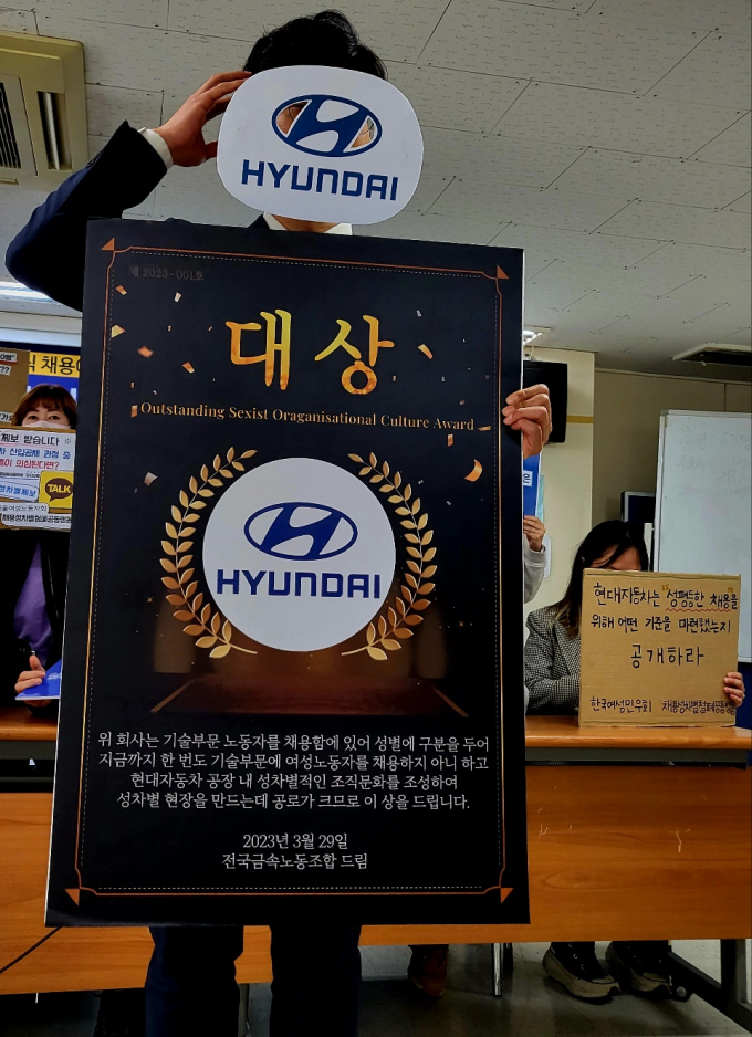 현대자동차 기업 정보에 따르면 2022년 연말 기준 여성 직원 비율은 6.3%로 2012년 보다 약 2% 증가했다. 노조는 “채용 공고에 남성만 채용한다고 쓰여 있지 않지만, 채용 게시판에는 여성이 지원해도 되는 일자리인지 묻는 글들이 올라오고 있다”며 “현대차가 스스로 공고히 유지해온 차별적 결과”라고 지적했다.