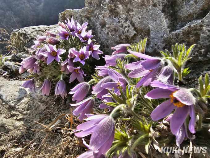 정선동강할미꽃축제가 열린 지난 1일 강원 정선군 정선읍 귤암리 강변 바위절벽에 활짝핀 동강할미꽃이 화사한 자태를 드러내고 있다.