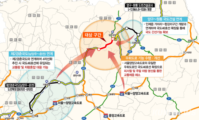 국도 46호선 춘천~양구 구간은 성수기와 주말마다 서울~양양 고속도로의 혼잡을 피하기 위한 대체도로로 사용하고 있어 교통수요가 급증하여 차량 지·정체가 심각하다.