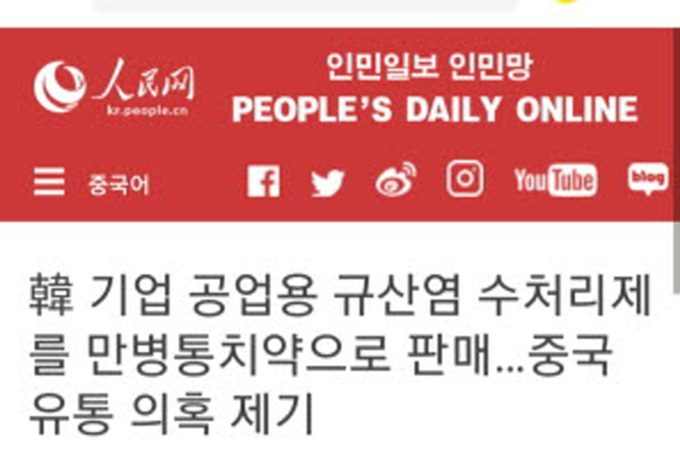 중국 관영매체인 인민일보 계열 인민망은 지난 6일 한국어판에 ‘韓 기업 공업용 규산염 수처리제를 만병통치약으로 판매…중국 유통 의혹 제기’이라는 제목으로 쿠키뉴스가 연속 보도한 내용을 사진과 함께 소개했다.
