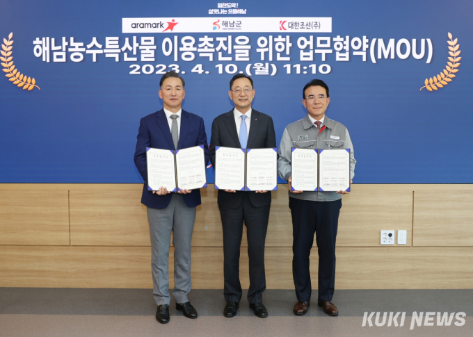 해남군은 10일 군청 상황실에서 명현관 해남군수, 심성호 아라마크㈜ 대표이사, 정대성 대한조선㈜ 대표이사 등 관계자 10여명이 참석한 가운데 해남농수특산물 이용촉진 및 상생발전을 위한 업무협약을 체결했다.