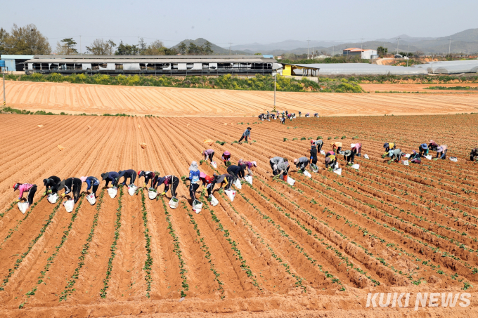 본격적인 농사철이 접어든 가운데 전남 영암군 들녘에서 황토고구마 순 심기가 한창이다. 도포면 영호리 들녘. 사진=영암군