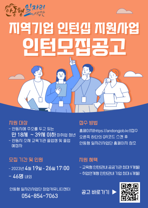 송인광 안동시 일자리경제과장은 “취업을 준비하는 청년들에게 현장 경험과 경력을 동시에 쌓을 수 있는 좋은 기회가 되길 바란다”며 “청년들이 지역 전략산업을 비롯한 다양한 분야에서 현장을 직접 경험하고 배우면서 꿈을 키울 수 있도록 인턴십 기회를 적극 지원하겠다”고 말했다.