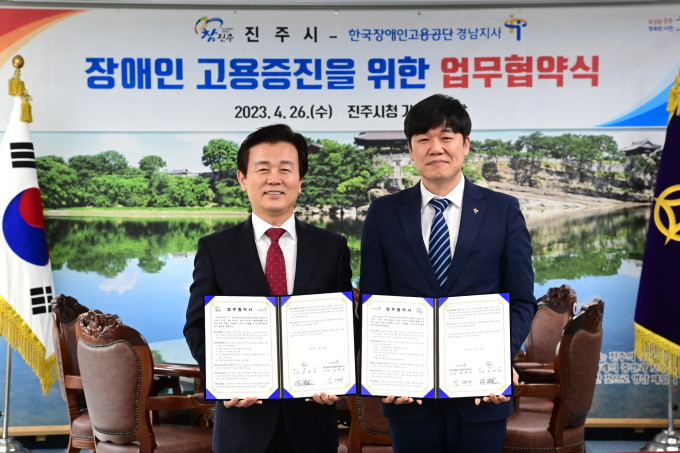 경남 진주시는 26일 장애인주간을 맞아 시청 기업인의 방에서 한국장애인고용공단 경남지사(지사장 김대규)와 '장애인 고용증진을 위한 업무협약'을 체결했다.