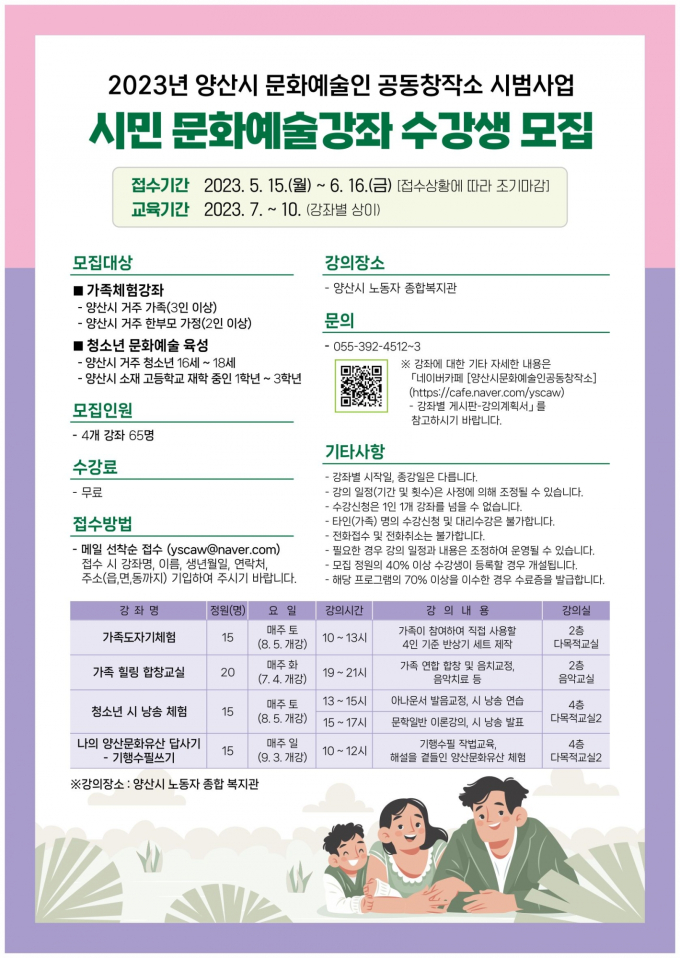 강좌는 일반시민 가족을 대상으로 한 가족 도자기 제작 체험과 가족 힐링 합창 교실 2개 강좌를, 지역 청소년을 대상으로 한 나의 양산문화유산 답사기-기행수필 쓰기와 청소년 시 낭송 체험 2개 강좌 등 총 4개 강좌로 진행한다.