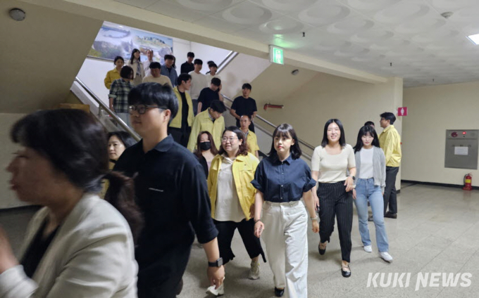 16일 제414차 민방위 날 대피훈련이 전국 동시 실시된 가운데 강원 화천군청 직원들이 군청 지하실로 대피하고 있다. 이날 민방위 훈련은 2017년 8월 이후 6년 만이다.