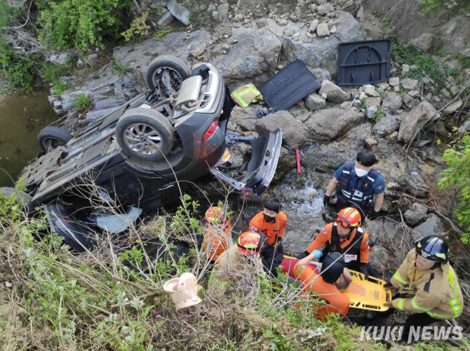 강원 인제서 승용차량이 하천으로 추락해 전복됐다