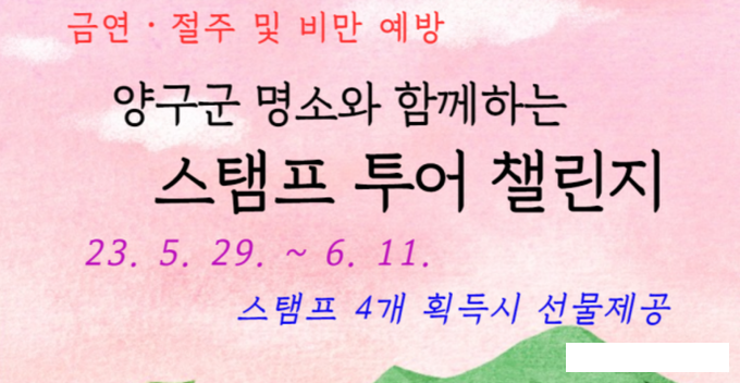 군은 스탬프 챌린지를 통해 스탬프 획득의 재미, 걷기 실천율 제고와 동시에, 양구군 관광명소를 스탬프 존으로 지정함으로써 양구군을 홍보할 수 있는 효과도 가져올 것으로 기대하고 있다.