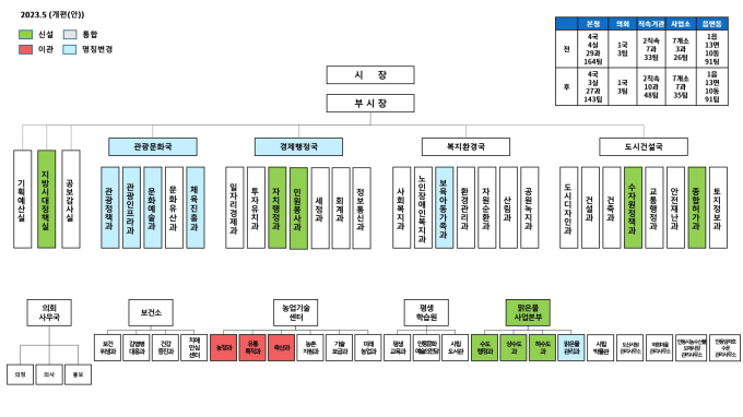 26일 시에 따르면 조직개편의 주요 내용은 ▲ 인구정책 부서 신설 ▲ 관광분야 개편 ▲ 종합허가과 신설 ▲ 맑은물사업본부 설치 ▲ 농정부서와 농업기술센터 통합 등이다.