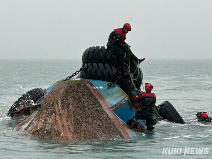 서해해양특수구조대가 현장에 출동, 전복된 예인선 선수 양측 에어벤트 2개를 봉쇄해 기름 유출 등 해양오염 방지작업을 벌이고 있다.