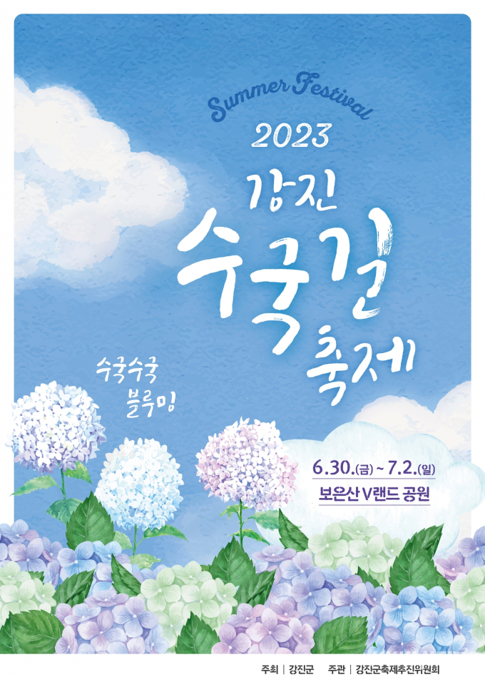 강진원 군수는 “존재 자체가 킬러 콘텐츠인 강진 수국을 활용해 다른 곳에서는 체험하기 어려운 즐길거리와 볼거리를 다양하게 마련했다”면서 “가족, 연인, 친구와 함께 ‘꽃보다 아름다운 사람들의 고장’ 강진에 오셔서 여름철 무더위를 마음껏 날려 보내시길 바란다”고 말했다.