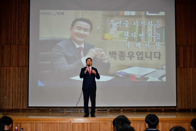 박종우 거제시장이 23일 오후 거제공업고등학교(교장 오민세)의 초청으로 학교를 찾아 거제의 미래를 알리고 학생들에게 자긍심을 심어주기 위해 특별 강연에 나섰다.