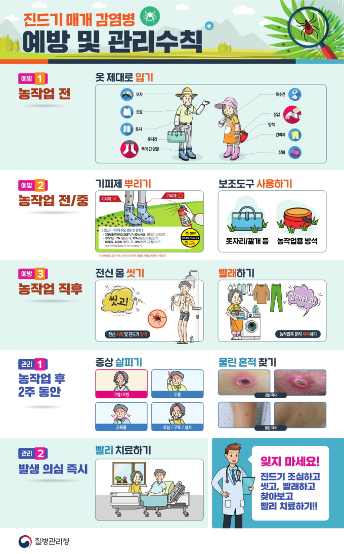 또 농경지, 텃밭, 공원 등 진드기가 서식할 수 있는 장소를 주민들에게 알려 환경정비 강화를 당부하는 한편, 야외활동을 할 때는 긴 팔, 긴 바지, 장갑 등을 착용해 달라고 안내했다.