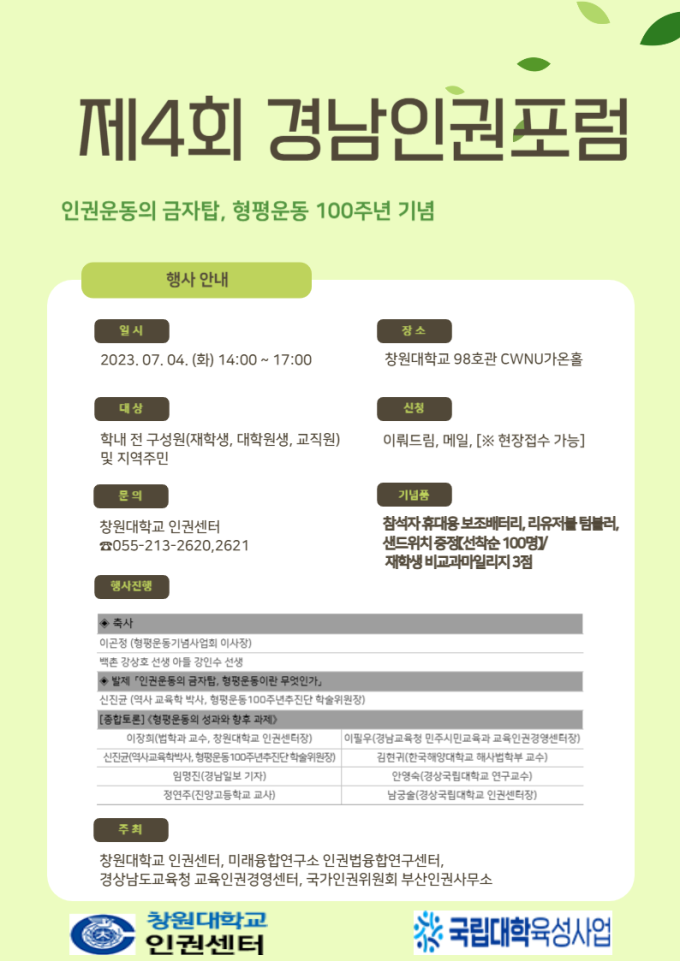 창원대학교(총장 이호영)는 4일 오후 2시 창원대 글로벌평생학습관(98호관) 1층 CWNU가온홀에서 ‘인권운동의 금자탑, 형평운동 100주년 기념’을 주제로 한 ‘제4회 경남인권포럼’을 개최한다.
