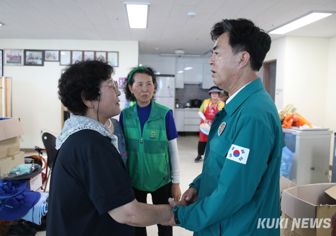 충남도가 호우 특별재난지역으로 지정된 공주시 등 4개 시군의 지적측량 수수료를 감면한다. 사진은 김태흠 지사가 지난 21일 집중호우때 큰 피해를 입은 공주시 옥룡동의 한 노인정을 찾아 주민을 격려하고 있는 모습. 충남도 내 호우 특별재난지역으로 지정된 4개 시군의 지적측량 수수료가 최대 100% 감면된다.
