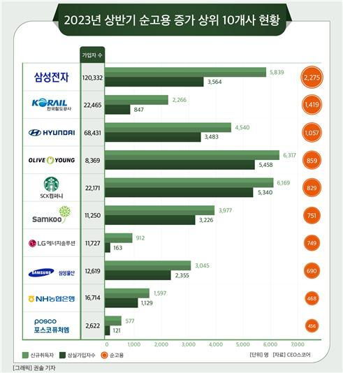 기업별로 보면 삼성전자의 순고용 증가가 전체 조사 대상 기업 중 가장 컸다. 2275명 증가했다. 한국철도공사 1419명, 현대자동차 1057명, CJ올리브영 859명, 에스씨케이컴퍼니 829명, 삼구아이앤씨 751명, LG에너지솔루션 749명, 삼성물산 690명, 농협은행 468명, 포스코퓨처엠 456명 등이다.