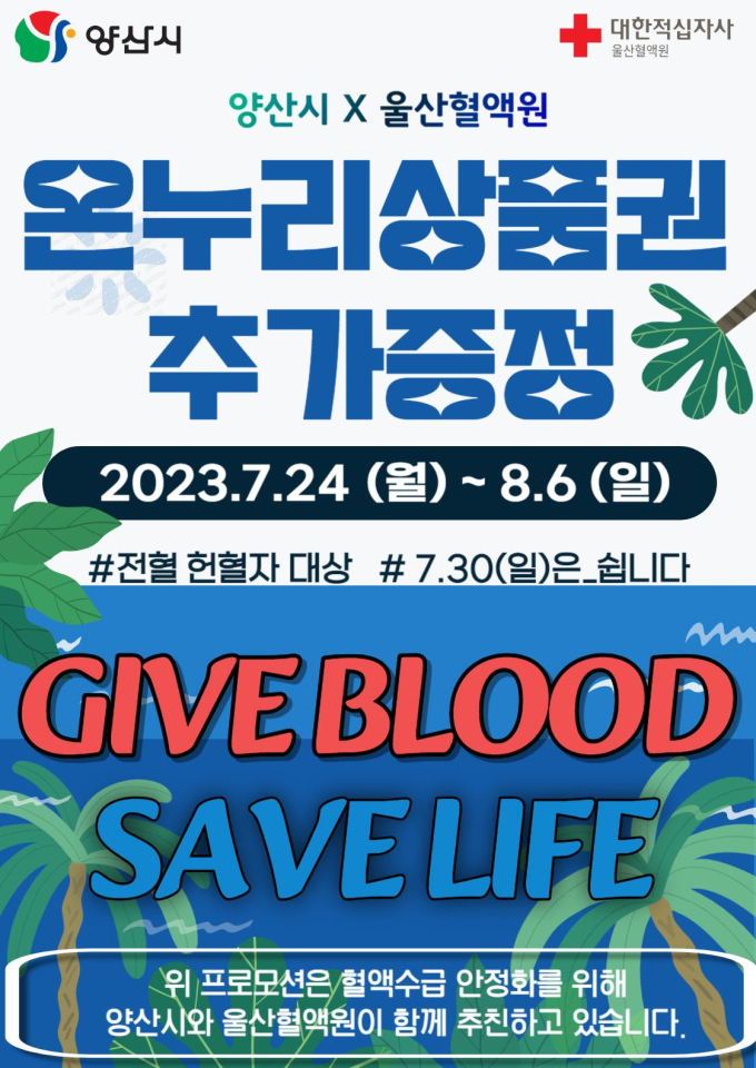 시는 대한적십자사 울산혈액원과 지난 4월 헌혈장려를 위한 업무협약을 맺었다. 이후 원활한 혈액수급을 위해 전혈 헌혈자에게 온누리상품권 1만원을 지급하는 프로모션을 2주간 진행한다.