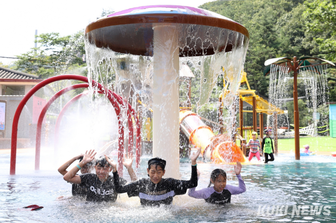 연일 무더위가 기승을 부리고 있는 가운데 4년 만에 새롭게 단장한 전남 강진군 도암면 석문공원 물놀이장을 찾은 어린이들이 물 폭탄을 맞으며 짜릿한 여름 맛을 즐기고 있다. 사진=강진군