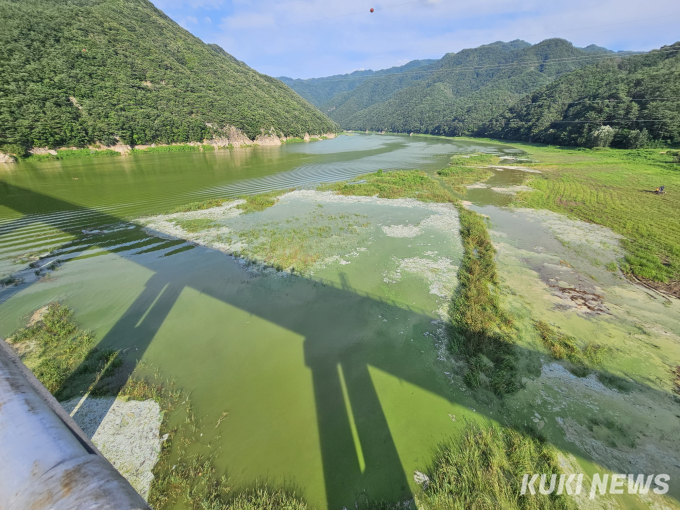 연일 폭염이 계속된 3일 오후 강원 인제군 소양호 상류가 녹조로 인해 물감을 풀어 놓은 듯 짙은 녹색을 띠고 있다.
