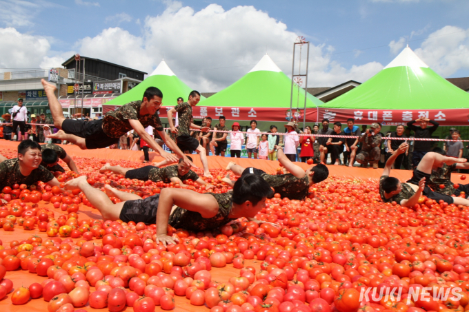 4일 오전 강원 화천군 사내면 사창리 일대에서 열린 화천토마토축제장을 찾은 군장병들이 황금반지를 찾으며 즐거운 시간을 보내고 있다.