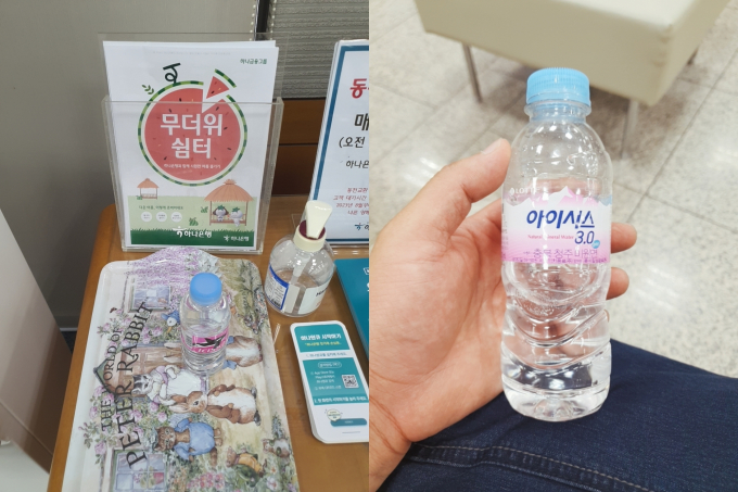우리은행 영업점 역시 청원 경찰이 맞이했다. 이번에도 동일하게 “쉬었다 가도 되냐”고 물어보자, 친절하게 “쉬었다 가라”는 대답이 나왔다. 우리은행 영업점은 별도의 생수는 없었지만, 정수기가 있어 시원한 물을 마실 수 있었다.
