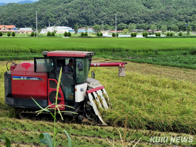 장마, 태풍, 폭염을 이겨내고 전남 장성군 황룡면 필암리 들녘에서 21일 올해 첫 조생종 벼가 수확됐다. 사진=장성군