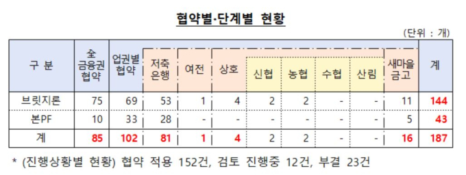 점검 결과 8월말 현재 총 187개 사업장에 ‘PF 대주단 협약’이 적용중이며, 그 중 152개 사업장에서 기한이익 부활, 신규자금 지원, 이자유예, 만기연장이 이뤄진 것으로 나타났다. 사업성이 없거나, 시행‧시공사와 대주단 간의 공동 손실분담이 부족한 사업장은 공동관리 부결(23개) 및 경‧공매 등을 통한 사업장 정리에 들어갔다.
