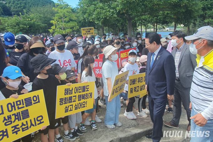 18일, 진도 실내체육관에서 열린 도민과의 대화에 참석한 김영록 도지사를 만나기 위해 해남 송지면 어민들과 어린이 등 400여 명이 피켓시위를 벌였다.