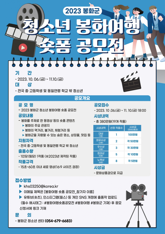 이번 공모전은 청소년의 재능과 창의적인 아이디어로 봉화의 관광지, 먹거리, 볼거리, 체험거리, 숨은 명소, 상징물, 맛집 등을 홍보하기 위해 마련됐다.