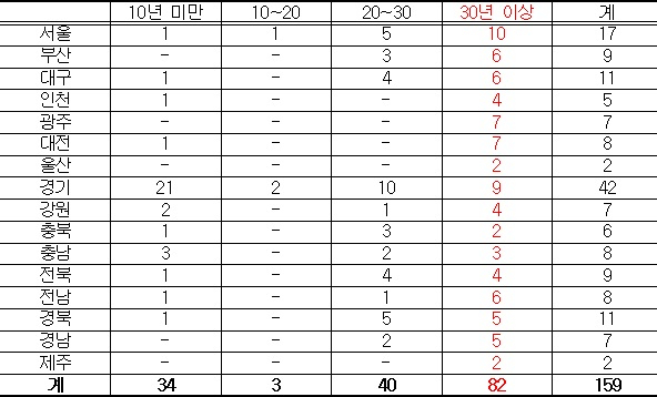 연식별로 보면, 159개소 사회복지관 중 51.6%인 82개소가 30년 이상 노후화된 것으로 나타났다. 20~30년 미만도 40개소(25.2%)였으며, 20년 넘은 복지관만 122개소(76.7%)에 달했다. 10년 미만은 34개소(21.4%)에 불과했다. 특히, 광주, 울산, 제주에 소재하는 복지관 모두 30년 이상 된 노후건축물이었다.