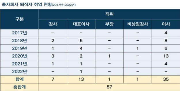 배당 못 받는 출자회사 절반 넘는데… 2급 이상 퇴직자 57명 대표이사, 감사로 억대 연봉 수령