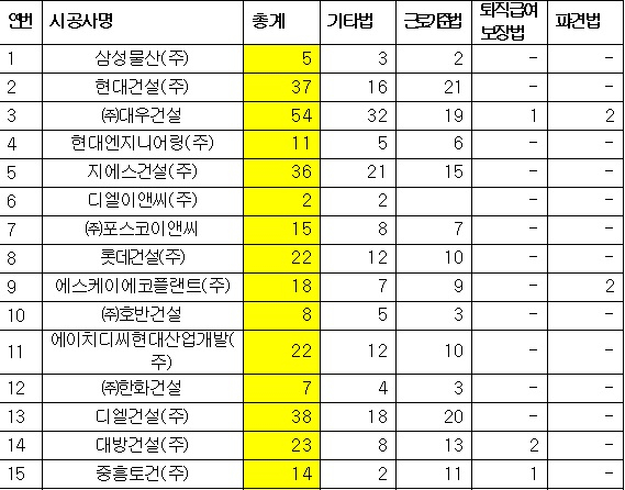 최근 5년간 시공능력 상위 20개 건설사가 위반한 고용노동부 소관법률 위반 총 416건 중 △근로기준법 위반 201건 △퇴직급여보장법 5건 △파견법 4건 △기타법 206건으로 나타났다. 특히 노동자의 기본적 생활을 보장하고 향상시키기 위해 제정된 근로기준법 위반이 48% 넘게 적발되어 건설노동자들이 제대로 된 보호를 받지 못한다는 지적이 이어졌다.