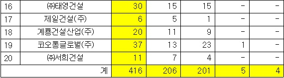 위반이 많은 건설사 순으로는 △대우건설 54건 △디엘건설 38건 △현대건설 37건 △코오롱글로벌 37건 △지에스건설 36건 △태영건설 30건 △대방건설 23건 △롯데건설 22건 △HDC 현대산업개발 22건 △계룡건설산업 20건 △SK 에코플랜트 18건 △포스코이앤씨 15건 △중흥토건 14건 △현대엔지니어링 11건 △서희건설 11건 △호반건설 8건 △한화건설 7건 △제일건설 6건 △삼성물산 5건 △디엘이앤씨 2건으로 나타났다.