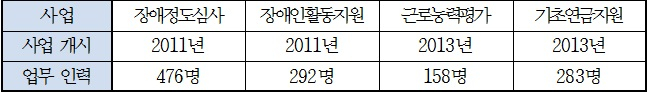 고영인 의원이 국민연금공단으로부터 제출받은 자료에 의하면 국민연금공단은 보건복지부에서 4개의 사업을 위탁받아 사업하고 있다. 장애정도심사, 장애인활동지원, 근로능력평가, 기초연금지원이다. 이 사업으로 채용한 인원은 총 1,201명이다.