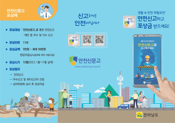 오미경 전남도 사회재난과장은 “안전신문고는 도민 모두가 안전지킴이로서 피해가 예상되는 곳곳의 위험 요인을 실시간으로 신고해 사고 없는 안전한 전남 만들기에 기여하면서 포상금까지 받을 수 있는 제도”라며 “안전에 대한 경각심과 재난을 미연에 방지하는 분위기 조성에 관심과 동참 바란다”고 당부했다.