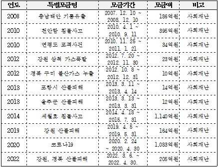 ‘사랑의열매’로 잘 알려진 사회복지공동모금회가 남인순 의원에게 제출한 ‘사회재난 관련 특별모금 활동 현황’에 따르면, 2014년 세월호참사 1,140억원 이외에도 2008년 충남태안 기름유출 186억원, 2010년 천안함 침몰사고 395억원, 2010년 연평도 포격사건 34억원, 2012년 강원 삼척 가스폭발 23억원, 2012년 경북 구미 불산가스 누출 10억원, 2013년 포항시 산불피해 14억원, 2013년 울주군 산불피해 12억원, 2019년 강원 산불피해 164억원, 2020년 코로나19 관련 1,083억원, 2022년 강원과 경북 산불피해 205억원 등을 특별모금한 것으로 집계됐다.