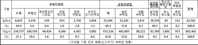 류호정 의원실이 문화체육관광부로부터 수령한 ‘2022년말 기준 전국 등록(신고·허가) 숙박업 현황 자료’에 따르면 「관광진흥법」, 「공중위생법」, 「농어촌정비법」 등을 근거로 숙박업소 현황이 관리되어 있었으나, 최근 인기를 끌고 있는 수영시설을 포함한 일명 ‘풀빌라’의 경우 정부의 관리 범위를 벗어나 무분별하게 난립하고 있다는 지적이다.
