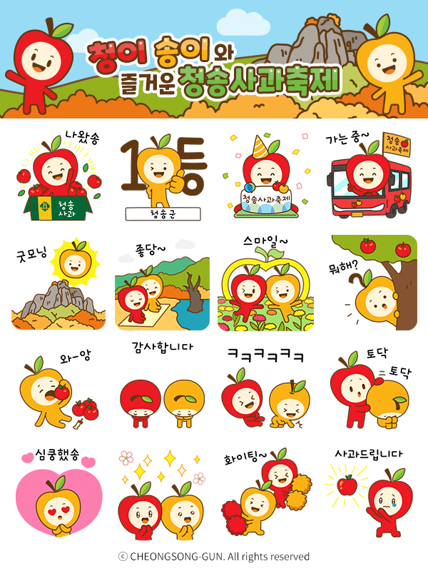 윤경희 청송군수는 “제17회 청송사과축제의 참여도를 높이기 위해 이모티콘을 만들게 됐다”며, “MZ 세대뿐만 아니라, 다양한 연령층이 청이와 송이 이모티콘을 사용해 즐거운 소통의 시간을 보내길 바란다”고 말했다.