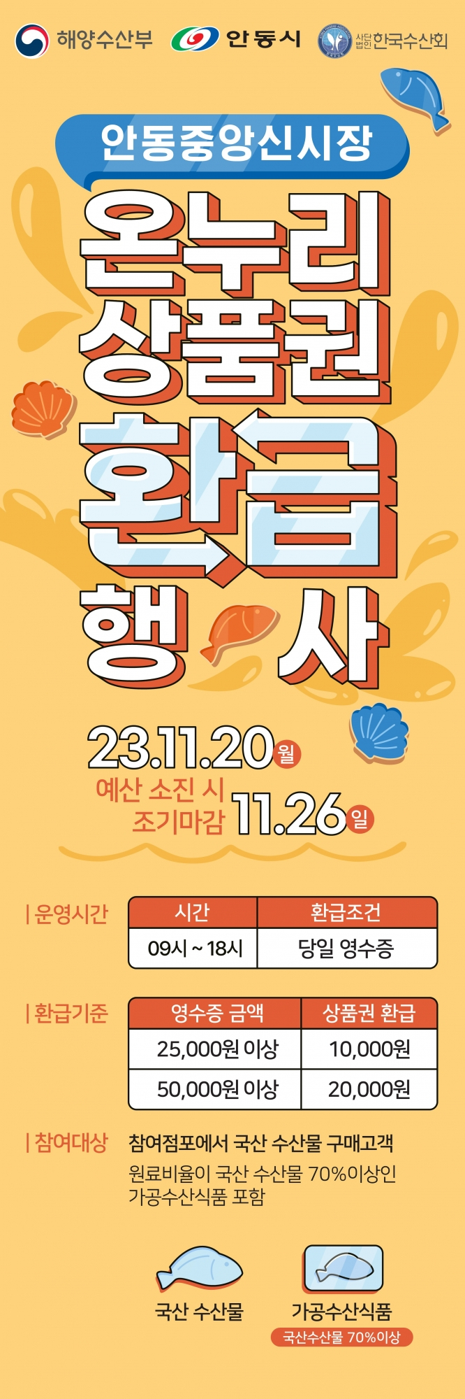 강석영 안동시 유통특작과장은 “전통시장 활성화와 수산물 소비 촉진을 위해 마련된 이번 행사에 시민의 많은 참여를 바란다”고 말했다.