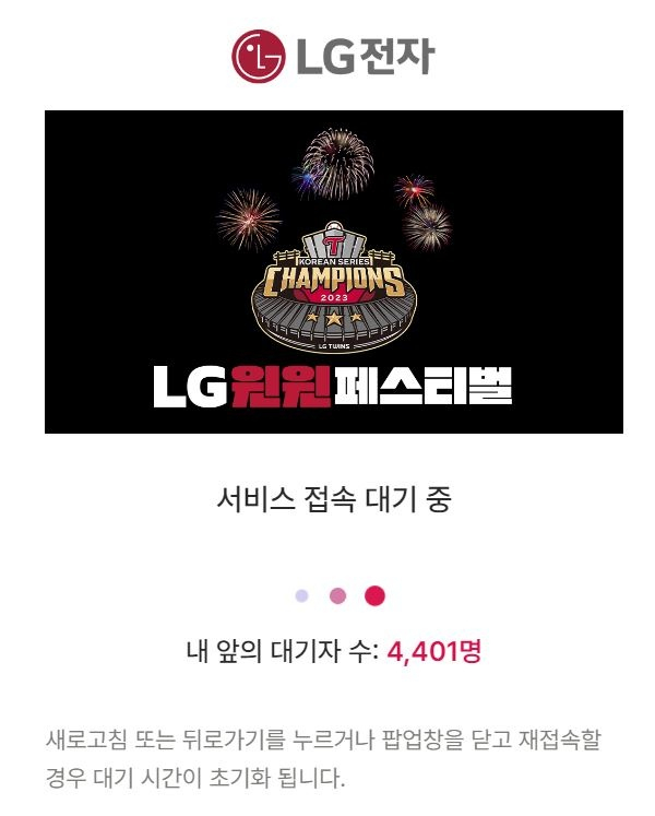 LG전자가 LG트윈스 한국시리즈 우승을 기념해 준비한 LG윈윈페스티벌 할인행사에 접속자가 대거 몰리며 홈페이지 접속장애가 지속되고 있다.