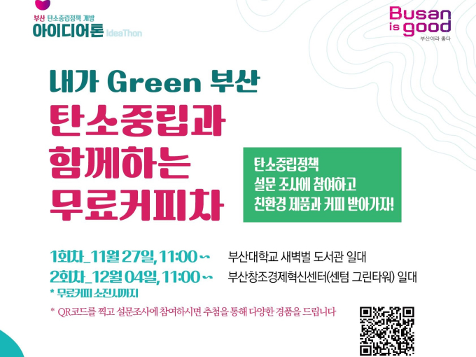 부산시는 11월 27일 부산대학교에서, 12월 4일에는 센텀시티 빌딩가에서 ‘내가 Green 부산, 탄소중립과 함께하는 무료커피차’를 운영한다.