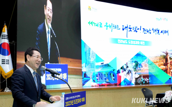 김 지사는 24일 오전, 완도군 농어민문화체육센터에서 신우철 완도군수와 허궁희 군의장 및 군의원, 이철(완도1, 민주)‧신의준(완도2, 민주) 도의원, 김옥연 완도소방서장을 비롯한 군민 등 150여 명이 참석한 가운데 2023년 완도군 도민과의 대화를 갖고 고향 완도에 대한 애정을 가감 없이 드러냈다.