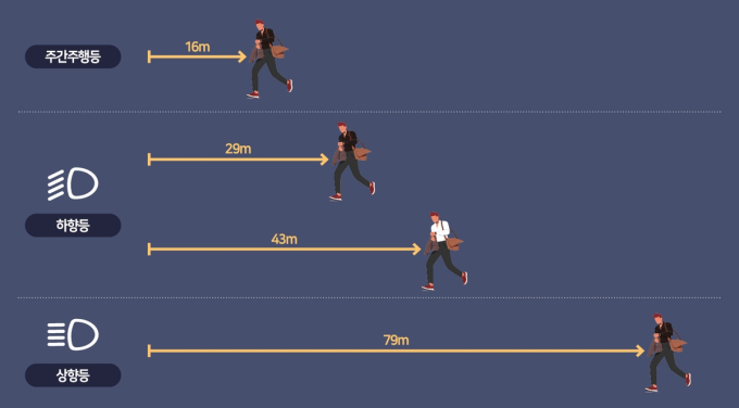 야간에 주간주행등만 켠 경우 운전자의 시야에서 보행자가 16m 앞에 다가와야 인식할 수 있었다. 야간에 주로 사용하는 하향등을 켜면 29m, 상향등을 켜면 79m 떨어진 보행자도 발견할 수 있다.