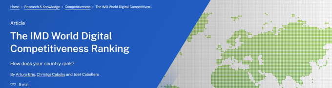 스위스 국제경영개발원(IMD)이 발표한 2023 세계 디지털 경쟁력 평가에서 한국이 전체 평가 대상 64개국 중 6위에 올랐다.